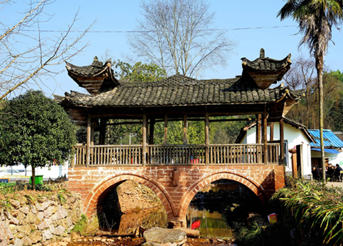 景沟地处邛崃西北属大同乡景沟村,其桥楼子建于景沟之上,距今村委会约50米。这座桥楼子虽谈不上高大宏伟,令人观止;但其典雅、别致而独特的造型却能让人一见难忘。现存的桥楼子建造在由红砂石砌成的双洞拱桥上,长8米,宽3.5米,高4米有余,横跨在溪水南流的景沟两岸,桥东头是通往大同乡唐沟的景唐公路,西头是前往石笋山的必经之道。青灰色的穿榫木结构桥楼子与黄红色的双拱石桥上下呼应,彰显出端庄古朴之典雅;桥楼子东西两端独特的品字形双层歇山式盖顶格外靓眼:“品”字上层犹似独立的小阁楼,檐下递缩式叠木构件凸显出歇山屋端飞檐、翘角的外张力度,与下层左右形若木漏斗之上的侧檐高翘的翼角,构成了两只状似展翅欲飞的鲲鹏。让原本静怡的桥楼灵动起来,给人以无限遐想。