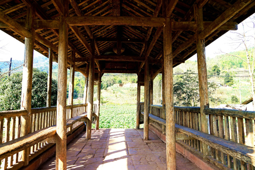 从桥东4步或桥西7步的石阶走进桥楼廊道,廊道左右每边4根内柱、6根外柱支撑着整座桥楼;桥楼外缘建有近1米高的木护栏将6根木柱连为一体;桥楼走廊两边的内外柱之间,顺桥搁置一整张与桥几乎等长、厚8厘米、宽约30厘米的青杠木板,作为休息的超长条凳或“稍(shào)台”(山区人称能放下背架或背篼休息的小块平台或石块为“稍台”,此称谓流行于川康各地山区)。据当地村民介绍,这个青杠木板条凳自建桥伊始使用至今。从磨得铮亮的木板和木质的陈旧度上可看出它经历年代的久远,也让人为此板材的坚硬、耐磨而感叹。