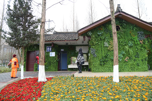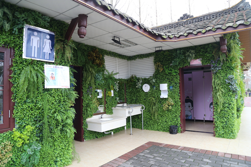 该公厕外墙全部装饰了绿色的仿真花草植物,公厕卫生纸、洗手液和干手器一应俱全,内部文君、相如的动漫形象萌动人心,搭配独特的立体绿化,被过往市民称“最美公厕”。