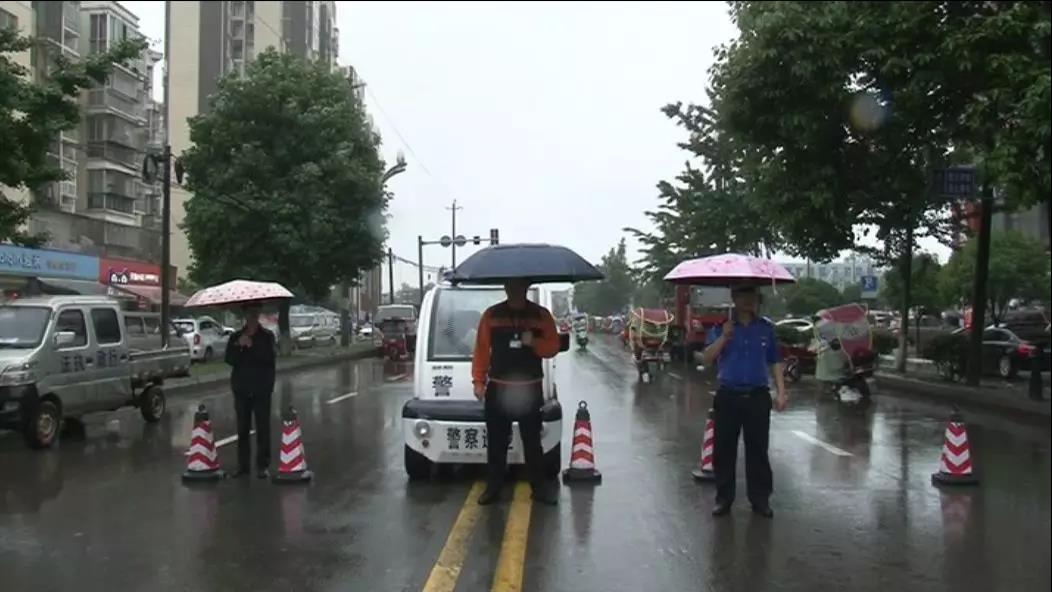 6号下午5点,离学生放学还有半小时。天空飘着小雨,在羊安镇九龙大道,几名执法人员正在劝阻来往通行的车辆。