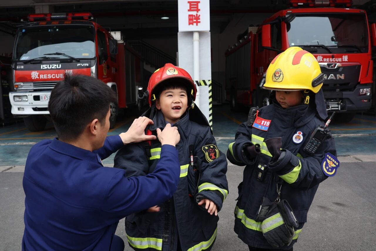 活动现场,消防员带领孩子们近距离了解各类消防装备器材,讲解其功能用途。“这是直流水枪,适用于堆垛、垃圾堆等火灾;这是抛投器,可在救援中远距离投送绳索或救生设备......”在消防员的讲解下,孩子们不仅认识了消防车辆和装备,而且通过试穿防护服、操作灭火器等实践体验,切实感受到消防安全的重要性。