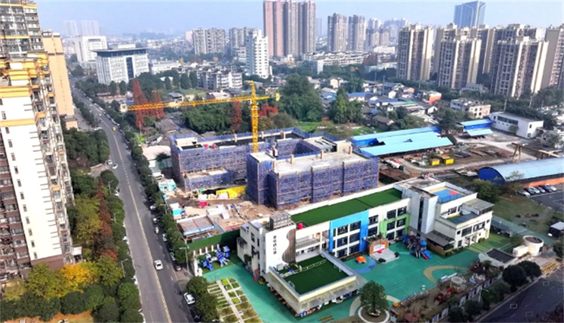 成都崃岭集团项目负责人冯毅勋说:“为保障学校在9月顺利开学,我们加班加点赶工,目前已经完成了总工程量的80%。”