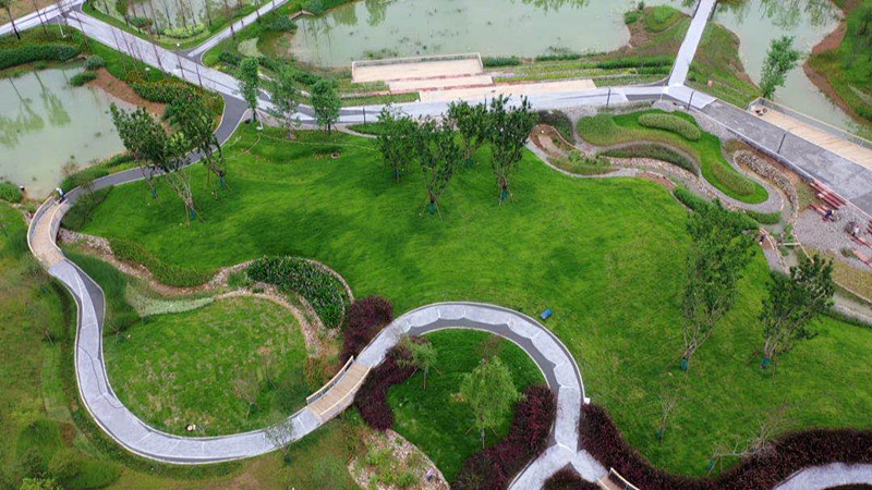 公园内,湿地环绕,绿植满园,一步一景,湖泊、绿地、廊桥、栈道与景观建筑相映成趣,一个景色优美,配套完善的公园形态已经呈现。