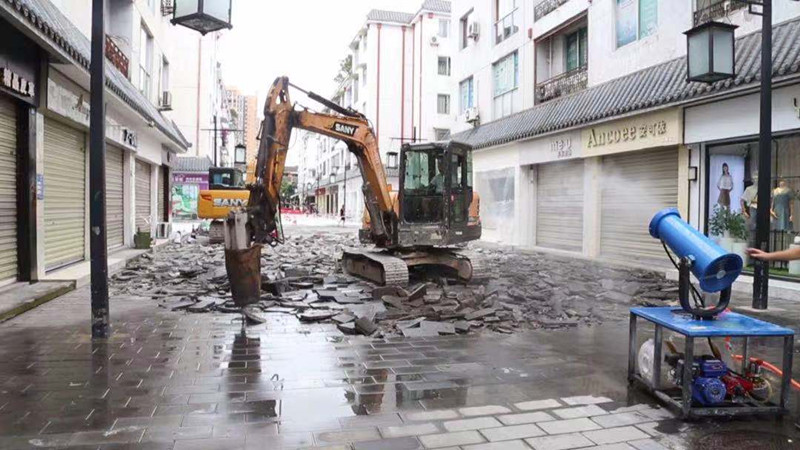 随后记者来到位于城中心的金色时代步行街,这里的大规模路面改造提升工程也正如火如荼,部分路段已完成路面铺设,大型机具正在对剩余路段进行破除。据介绍,该点位施工面积约4500平方米,施工完成后,步行街区域内的道路将全部更换为更加整洁、耐磨的混凝土路面。