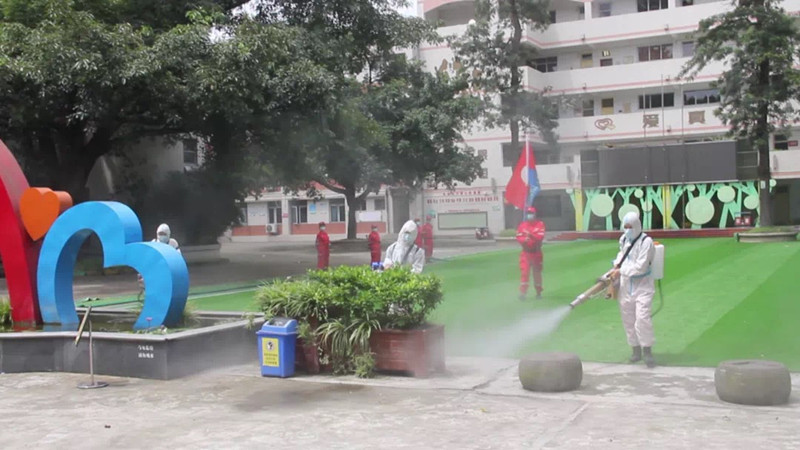 消杀人员对学校行政楼、教学楼、校园道路、操场等公共场所逐一实施清扫消毒防疫,重点对教室、楼道、洗手间等关键区域实施密集消毒,不漏掉任何一个死角。