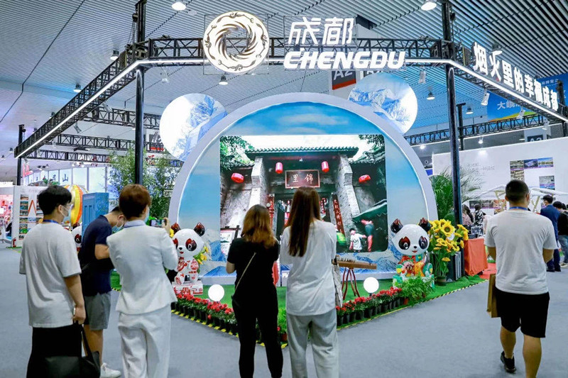 本届旅博会将持续至9月5日,以“文化旅游高质量发展”为主题,设立品质旅游展、旅游装备展、旅游融合展、中国特色旅游商品四大展览,以“室内+室外”“线上+线下”“动态体验+静态展示”相结合立体组展,突出多元化、多样性、适用性特色。其中,成都馆以“雪山下的公园城市 烟火里的幸福成都”为主题,集合“2021最成都·生活美学新场景”中的五大文旅新场景类别,通过多种科技沉浸式交互体验,向与会嘉宾、展商、文旅企业、媒体代表及游客生动展示了成都新场景、新旅游的魅力。