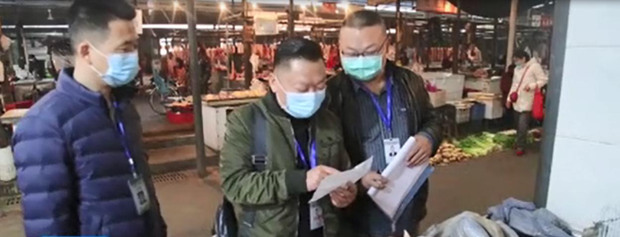 3月6日早上,执法大队副大队长马磊与队员一道,来到了城南市场,检查市场禽类销售摊位和市场的消杀措施是否到位。