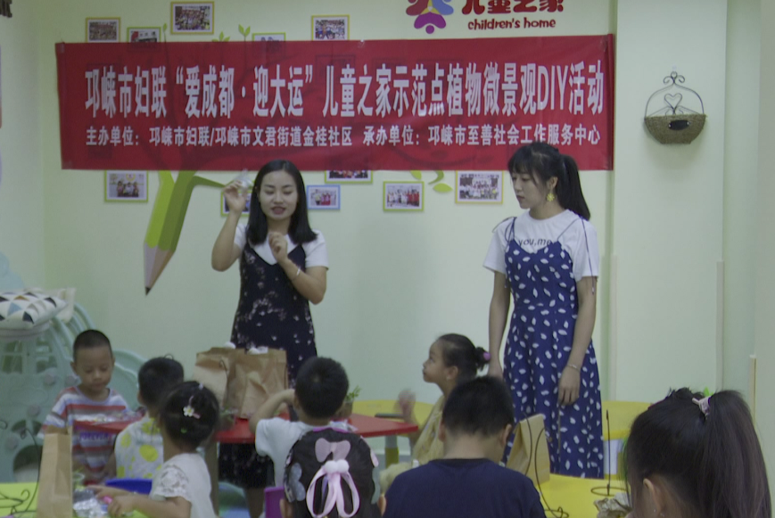 8月25日上午,金桂社区“儿童之家”洋溢出阵阵欢声笑语。来自20多个家庭的孩子兴高采烈参与到“爱成都.迎大运”儿童之家示范点植物微景观DIY活动中。在指导老师的悉心指导下, 孩子们在景观瓶中铺上一层轻石和湿润的水苔,倒入营养土砌成小斜坡,栽入网纹草、蕨草等植物,加入剩余的营养土,喷水,用小铲子压实,再铺上苔藓、倒入白色和蓝色的小沙石,最后放上可爱的小玩偶,令人赏心悦目的微景观就制作完成了。