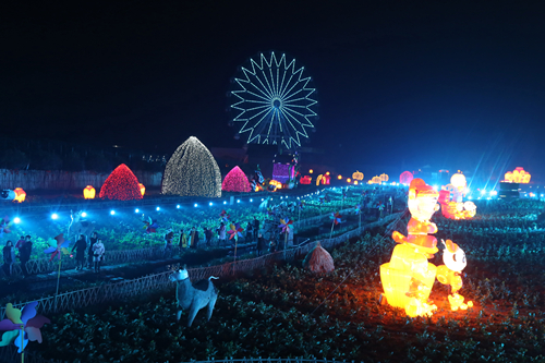 16日,大年初一晚7时许,夜幕初临,田园乐翻天景区内亮起彩灯,红彤彤的灯笼随处可见,大门口“春夏秋冬”四季财神喜迎宾客,左右两侧酒灯明亮;“月月红”十二生肖超萌财神分布田园间,萌趣十足;500余盏“酒”灯点亮田园,还有火红的铜钱门、爱心门,彩灯装饰下的摩天轮犹如夜空中盛开的花朵……造型各异的彩灯吸引众多游客拍照留影,五光十色的炫彩灯光将整个田园装点得犹如仙镜,让人流连忘返。