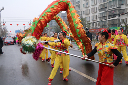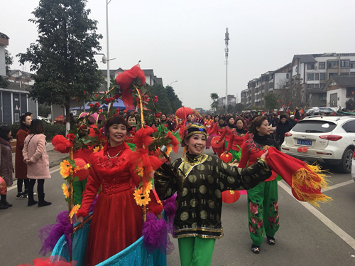 2月14日上午,羊安镇街头人山人海、锣鼓喧天,夹关女子龙灯、夹关高跷、平乐牛儿灯、文君幺妹灯、牟礼花杆队等近100人组成的特色民俗文化队伍来到这里进行民俗文化巡游展示,向市民送上新春祝福。