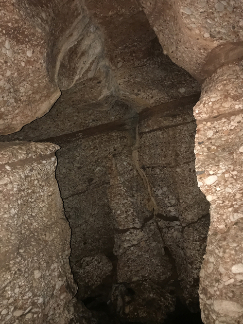 洞壁为红色页岩(红砂石)与砾石,砾石被当地人称之为“子母石”,砾石与红砂石一层一层地互为交叉。红砂页岩与砾石都是沉积岩,砾石的形成应是火山喷发后,无数的卵石与岩浆石粉和砂土经长期沉淀挤压而成的,其状如当今之混泥土,砂石相间。洞壁非常光滑,想必是在未成山之前一定处在低洼之处,被流水长期冲刷之故。此“仙人洞”洞中有洞,叉道很多,各叉道皆不如平时所见之溶洞,一般情况下,溶洞有许多石笋、石经幡、石钟乳等,此洞鲜有岩浆,难见此等东西,而这些叉道洞口并非是圆洞形,而是扁形,就如刀砍斧劈一样,又如磞裂之缝隙。这些缝隙的形成,也应该是在造山运动时,地壳被挤压而拱起,又由于韧性不足,这些沉积岩发生断裂而形成,所以非常不规整,就形成如今这种缝隙状的洞口。