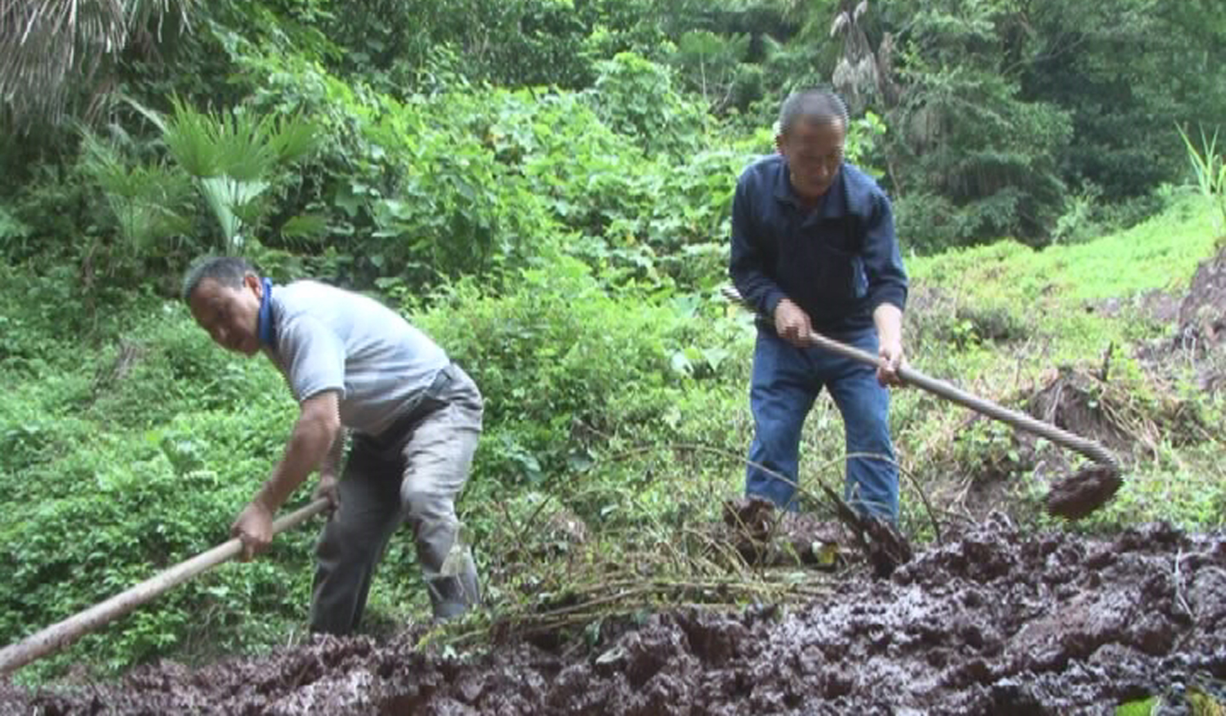 崎岖的山路,弯弯转转,再加上这几天的暴雨,路面湿滑。经过一个多小时的路程,王万林来到受灾群众苏月贵家后面山坡,仔细查看山体有没有新的裂缝、移位。看到苏月贵正在清理塌方的泥土,他便拿上工具,帮助清理。