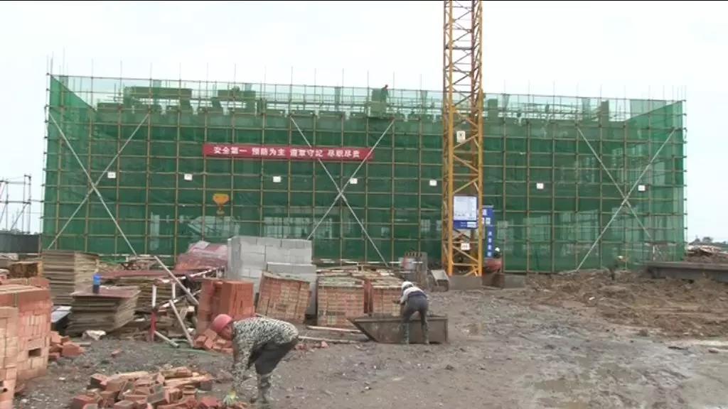 在种子检测实验中心项目后面,种业孵化中心项目呈现出一派热火朝天的景象,塔吊、工人按照施工工序,加快钢结构的安装。