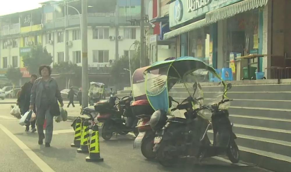 在长松路,记者看到有不少公共机动车停车位上,停放着电动车、三轮车等交通工具。在原本机动车停车位就紧张的情形下,一些临街商户利用停车牌和障碍物占用门前的停车位,让车主无法停车。在文南路、阳光路等街道,许多商家利用锥形桶及广告牌等物体占用公共机动车停车位。