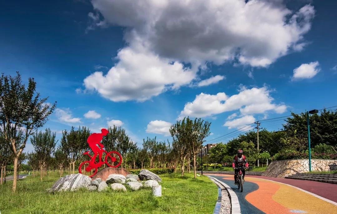 绿道公园,相得益彰。红褐色的绿道,宽敞整洁,随地势起伏而起伏,随地形曲折而曲折,随河水流动而流动,像条彩带在公园旁、树林中、草坪花丛间飘舞翻腾。