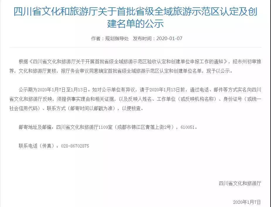 1月7日,记者从四川省文化和旅游厅获悉,根据《四川省文化和旅游厅关于开展首批省级全域旅游示范区验收认定和创建单位申报工作的通知》,经市州初审推荐,文化和旅游厅复核,报厅务会审议同意确定首批省级全域旅游示范区认定和创建单位名单,并于2020年1月7日至1月13日期间进行公示,邛崃市位列其中。