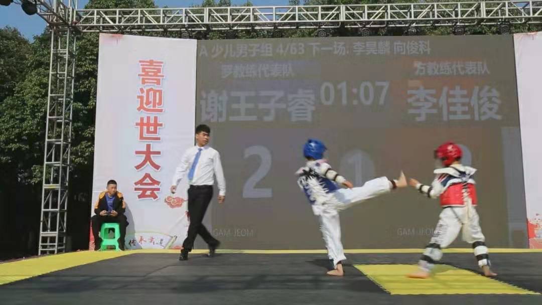 前踢、横踢或旋踢,你来我往出招格挡,动作刚劲有力……下午1时,比赛正式打响,来自全市多个片区的上百名青少年儿童齐聚体艺健身中心,在擂台赛挥洒汗水,奋力拼搏。