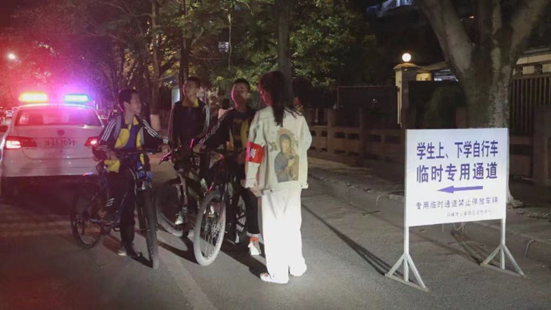 晚上8点20分,正值文昌中学学生晚自习下课,放学铃声一响,同学们像是被放飞的鸟儿一般涌出了学校,一大批学生骑着自行车在路边等待过马路,民警立马站在马路中间,指挥车辆停车让行,全力以赴守护孩子们的放学路。