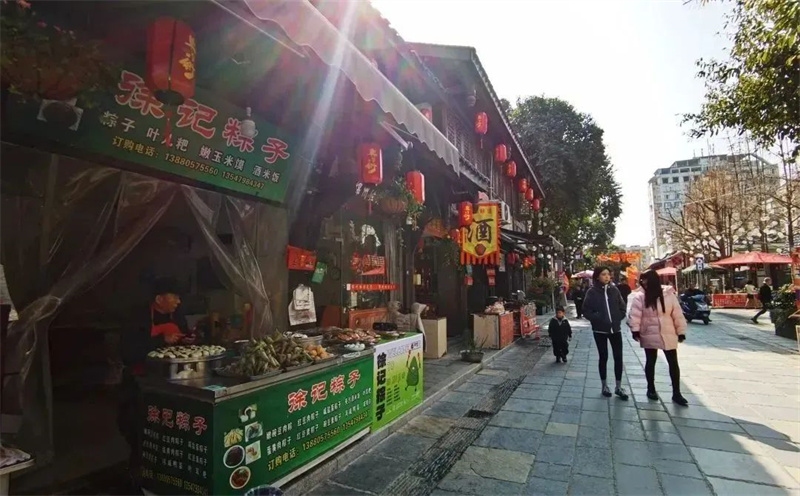 固驿烧鸭子,一年四季都畅销的粽子、冻粑……在兴贤街,每个人都能找到自己钟情的“老字号”。牌坊一侧,还统一规划了新的美食商业区,统一的明黄色小餐车,贩卖着热气腾腾的小吃,为整个街道增加了一抹亮色。