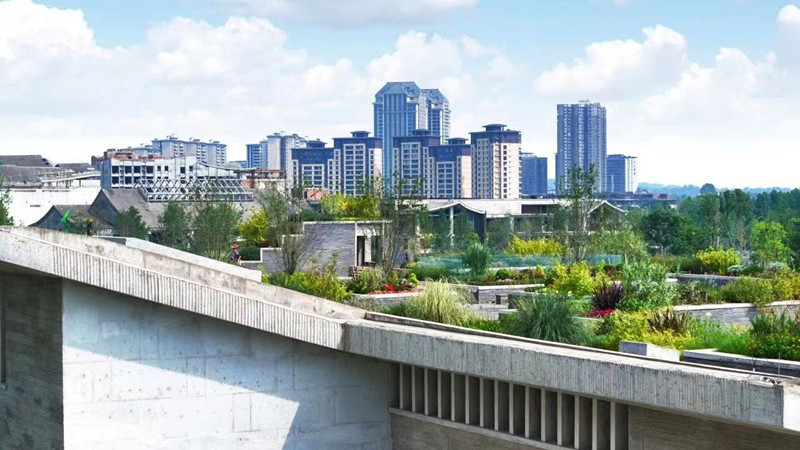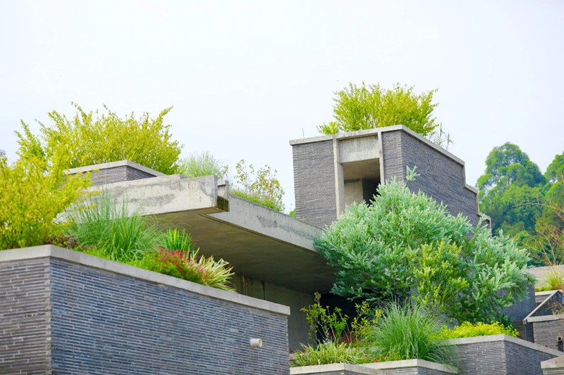 设计提取中国传统建筑的坡顶元素赋予形态,利用川西传统建筑常用的天井院落组织空间,组合黑顶白墙的地域建筑材料语言,通过当代设计手法,抽象传达地域文脉和邛窑文化内涵。建筑形态顺应周边景观,采用南高北低的斜坡面,聚合地景式布局,斜坡休闲广场取中国传统建筑的“黛瓦”意向,通过石材的多种肌理变化和白墙、天井、树池、台阶等穿插组合搭配,达到整体色调统一、细节丰富细腻的效果,成为市民公共活动的景观花园。