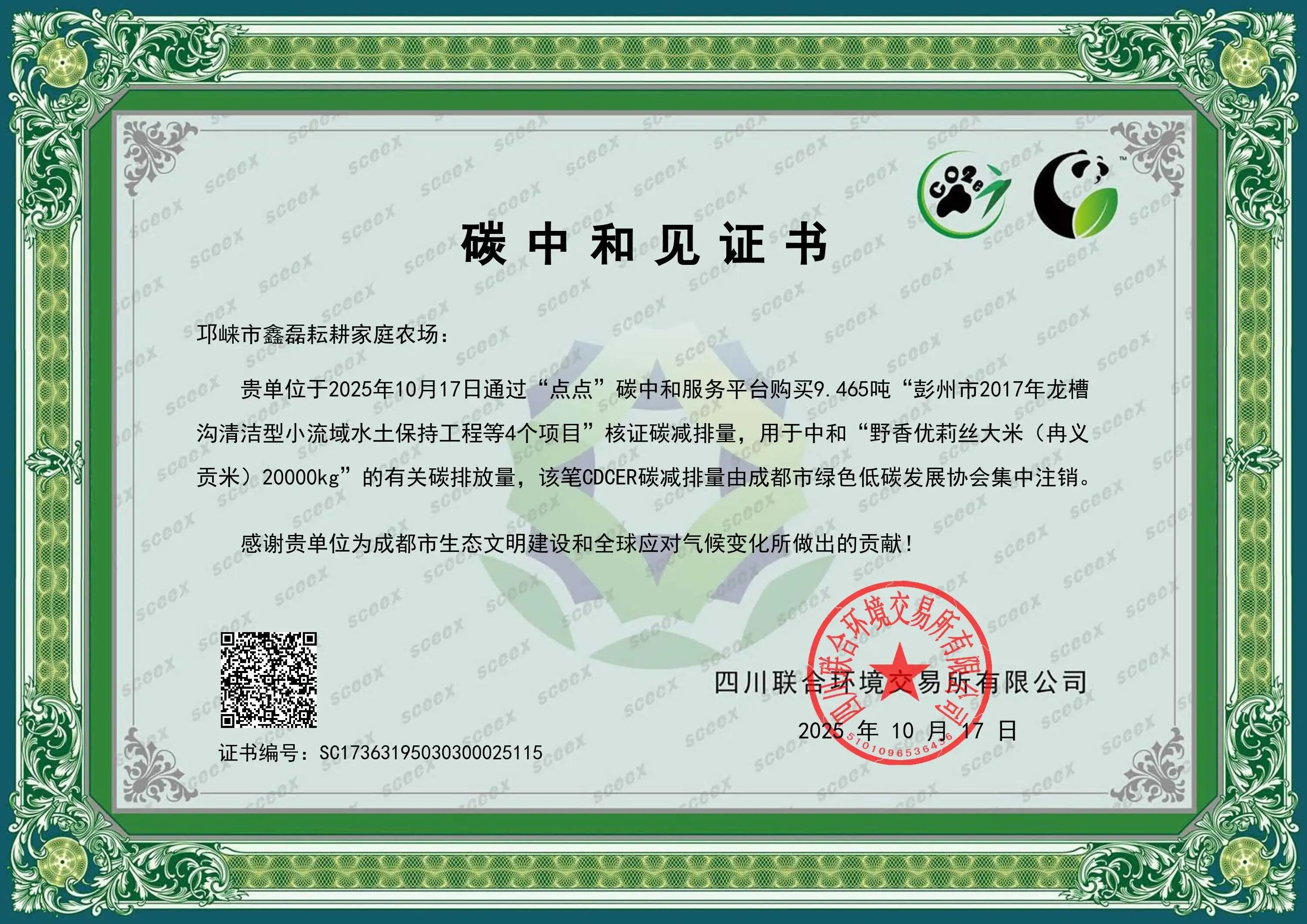 鑫磊耘耕家庭农场与四川国碳科技有限公司自去年起展开合作,采用有机施肥替代化学肥料、实施节水灌溉技术、应用智慧农业管理系统等低碳种植技术,通过精准核算每个生产环节的碳排放、提升土壤活力与资源使用效率、优化加工和包装流程降低能耗等生产减排措施,实现碳中和目标。通过碳足迹核算和碳标签认证,获得权威机构颁发的碳中和证书。