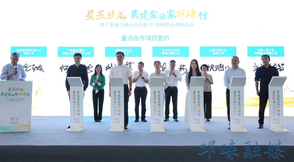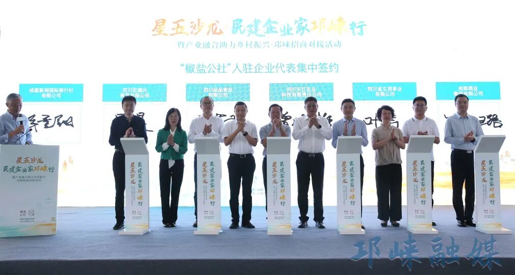 四川省政协副主席、民建四川省委主委、四川省中华职业教育社社务委员会主任谢商华,成都市人大常委会副主任、民建四川省委会副主委、民建成都市委会主委史红平,成都市委统战部常务副部长、一级巡视员戴浚,邛崃市委书记刘刚出席活动并致辞。民建四川省委会副主委、省政协副秘书长李芳芳,成都传媒集团董事长、成都传媒产业集团党委书记、董事长母涛,邛崃市政协党组书记、主席肖瑶出席活动,见证签约仪式并参加“椒盐公社”启动仪式。民建四川省委会、民建成都市委会,成都市农业农村局、成都市商务局、成都市投资促进局、成都市文化广电旅游局、邛崃市委市政府相关负责人,以及来自农业、文旅、文创、科技、传媒等领域的200余名企业家、学者及政府代表参加活动。