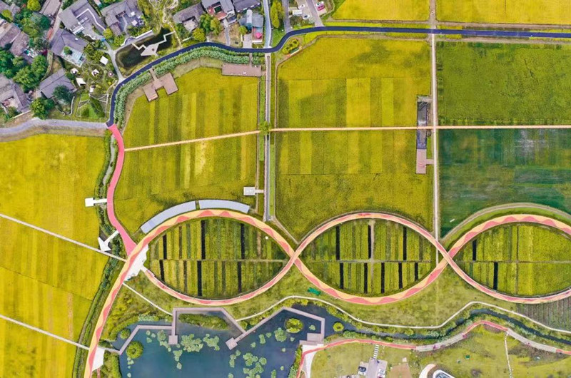 9月30日,天府现代种业园内的上千亩水稻刚刚收获结束,稻田内铺满了金黄的秸秆。金色的原野上,一栋栋展馆大楼拔地而起,和田野融为一体。